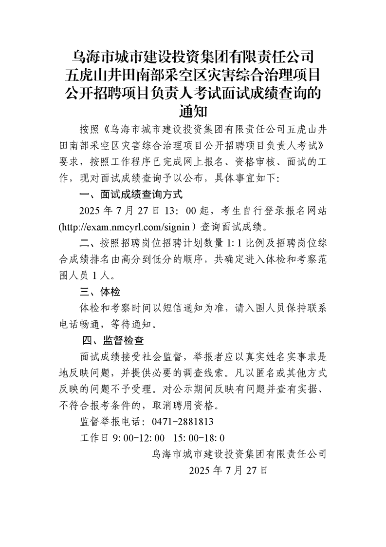 烏海市城市建設(shè)投資集團(tuán)有限責(zé)任公司五虎山井田南部采空區(qū)災(zāi)害綜合治理項(xiàng)目公開(kāi)招聘項(xiàng)目負(fù)責(zé)人考試面試成績(jī)查詢的通知